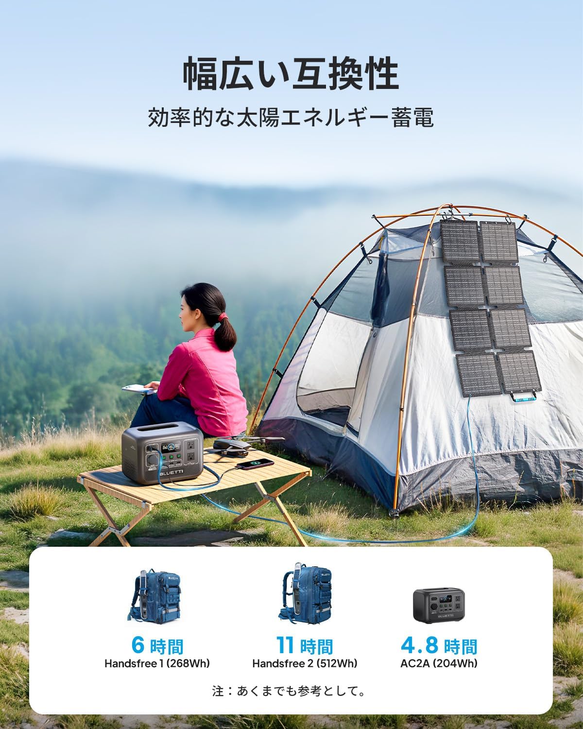 BLUETTI 60Wソーラーパネルは、わずか1.4kgという驚異的な軽さと24.7%の高変換効率を両立した折りたたみ式ソーラーチャージャーです。USB-A・USB-C・DC出力の3系統を備え、ポータブル電源への充電からスマホやタブレットの直接充電まで1枚でカバーできるため、荷物を最小限に抑えたいソロキャンパーや防災備蓄用途に最適な一台です。