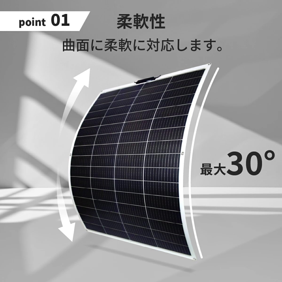 - ✓ 車中泊やキャンピングカーで電力を確保したい方(厚さ2.5mmのフレキシブル素材で車体の曲面にフィットする設置が可能)