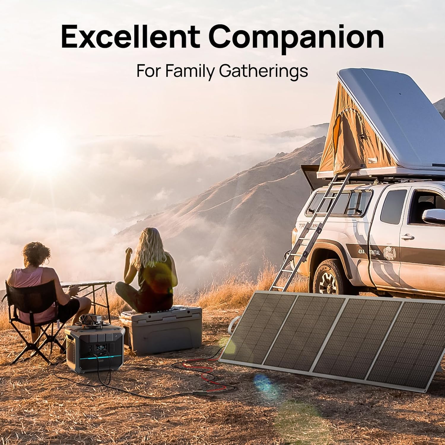 MC4出力で車載ポータブル電源に接続でき、IP54防水で車外のルーフや地面への設置も安心。300Wの高出力により、車中泊で使用する電気毛布や小型冷蔵庫などへのポータブル電源経由の電力供給に十分対応できる。折りたたみ式のため使わない時はコンパクトに収納可能だ。