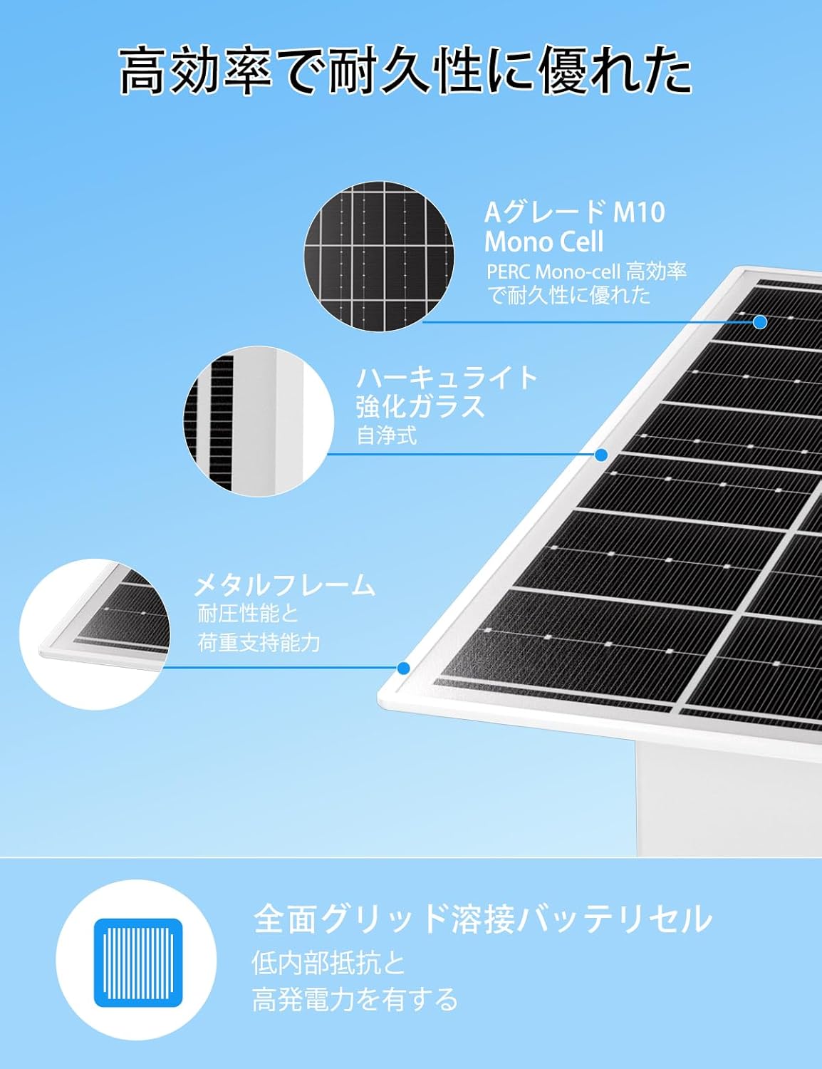重量2.7kgはデータベース平均8.2kgの約3分の1で、壁面取り付けや持ち運びに適した軽量設計です。229×306mm・厚さ60mmのリジッドパネル構造で、折りたたみ式のような可動部がないため耐久性に優れています。防水仕様と記載されていますが具体的なIP等級は非公開のため、常時屋外に設置する場合は設置角度や庇の有無も考慮することを推奨します。