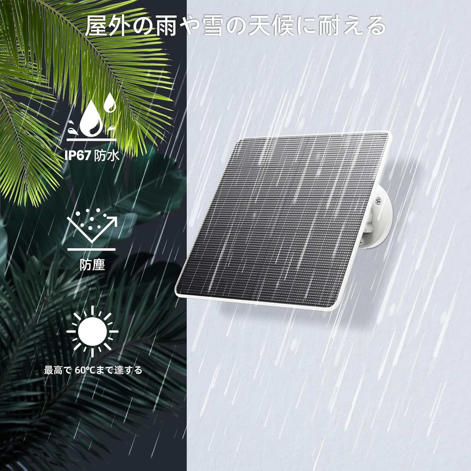 IP67の防水規格を取得しており、雨天や厳しい気象条件下でも安心して屋外に設置できます。ただし曇天や雨天時は日照量が減少するため、発電量は晴天時と比べて大幅に低下します。