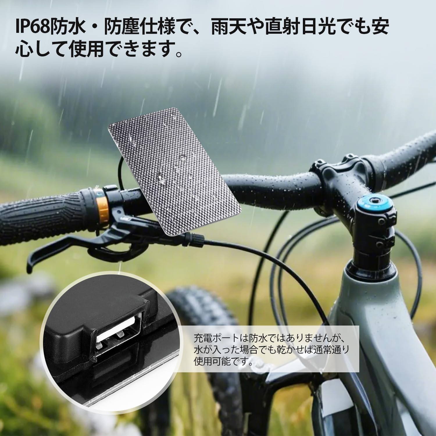 IP68防水防塵等級を取得しており、雨天走行中でも問題なく使用できます。IP68は粉塵の侵入を完全に防ぎ、水没にも耐える最高レベルの防水規格です。ただし、曇天・雨天時は太陽光が弱まるため発電量は晴天時より大幅に低下します。