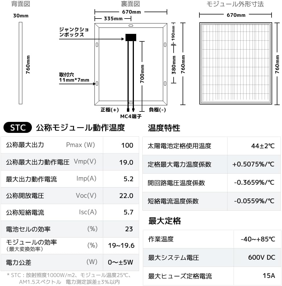 最大出力100Wの単結晶ソーラーパネルで、データベース平均150Wと比較するとやや控えめな出力ですが、760×670mmというコンパクトなパネルサイズを考慮すると面積あたりの発電効率は非常に優秀です。システム電圧やVmp・Imp・Voc・Iscの詳細値は製品ページでの確認が推奨されますが、12Vシステムとの互換性が期待できる仕様です。
