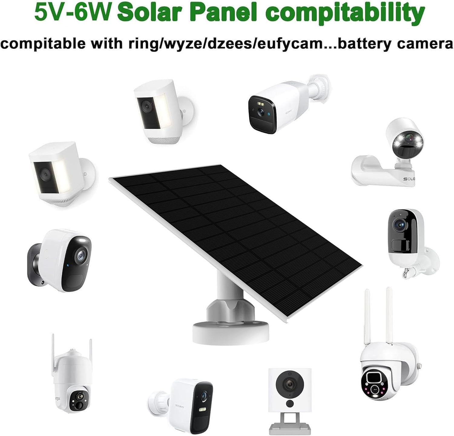 Wyze Outdoor V1/V2 Battery Modelsとの互換性があります。付属のmicroUSBまたはType-Cコネクタでカメラの充電ポートに接続でき、日中のソーラー充電でバッテリー残量を維持します。6W出力は屋外カメラの待機電力を補うのに適した容量です。