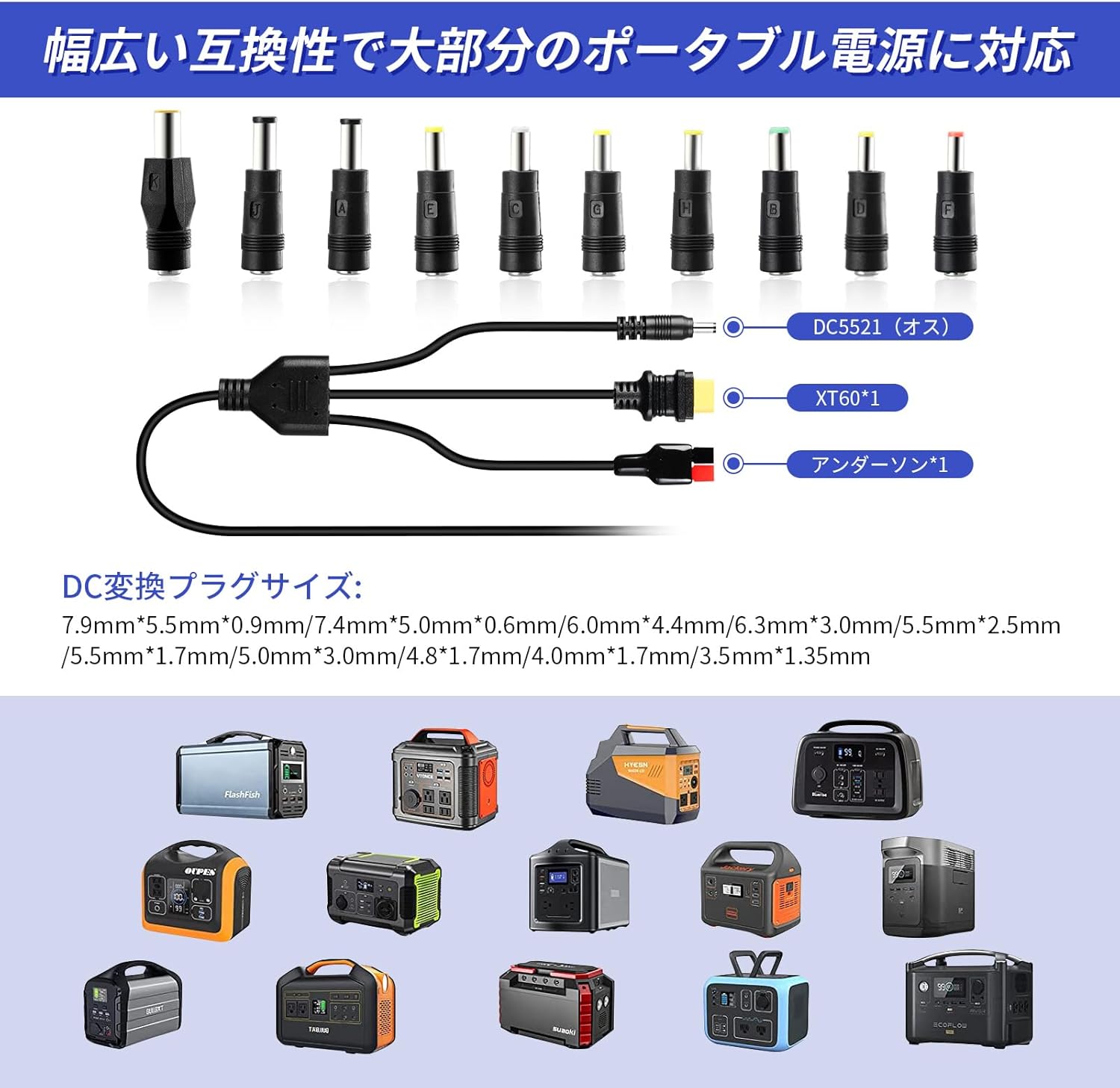 DC5521・アンダーソン・XT60の3-in-1コネクタに加え10種のDC変換プラグ付属で、Jackeryをはじめ主要ポータブル電源との互換性が高い