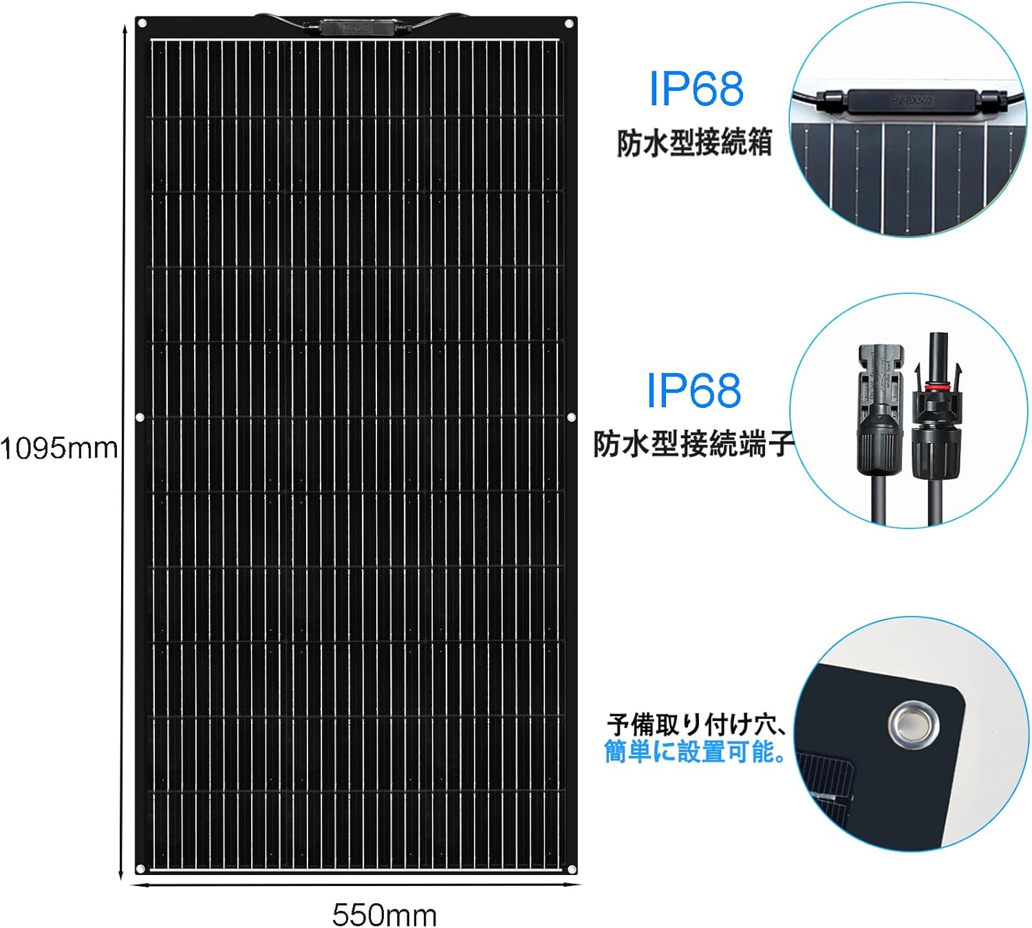 車中泊用途にはIP68防水で屋外設置に安心、3.0kgの軽量設計で車両への負担が少ない点が魅力です。ただし出力100Wはデータベース平均150Wを下回るため、大容量のポータブル電源を素早く充電したい場合は複数枚の併用や上位モデルの検討もおすすめします。