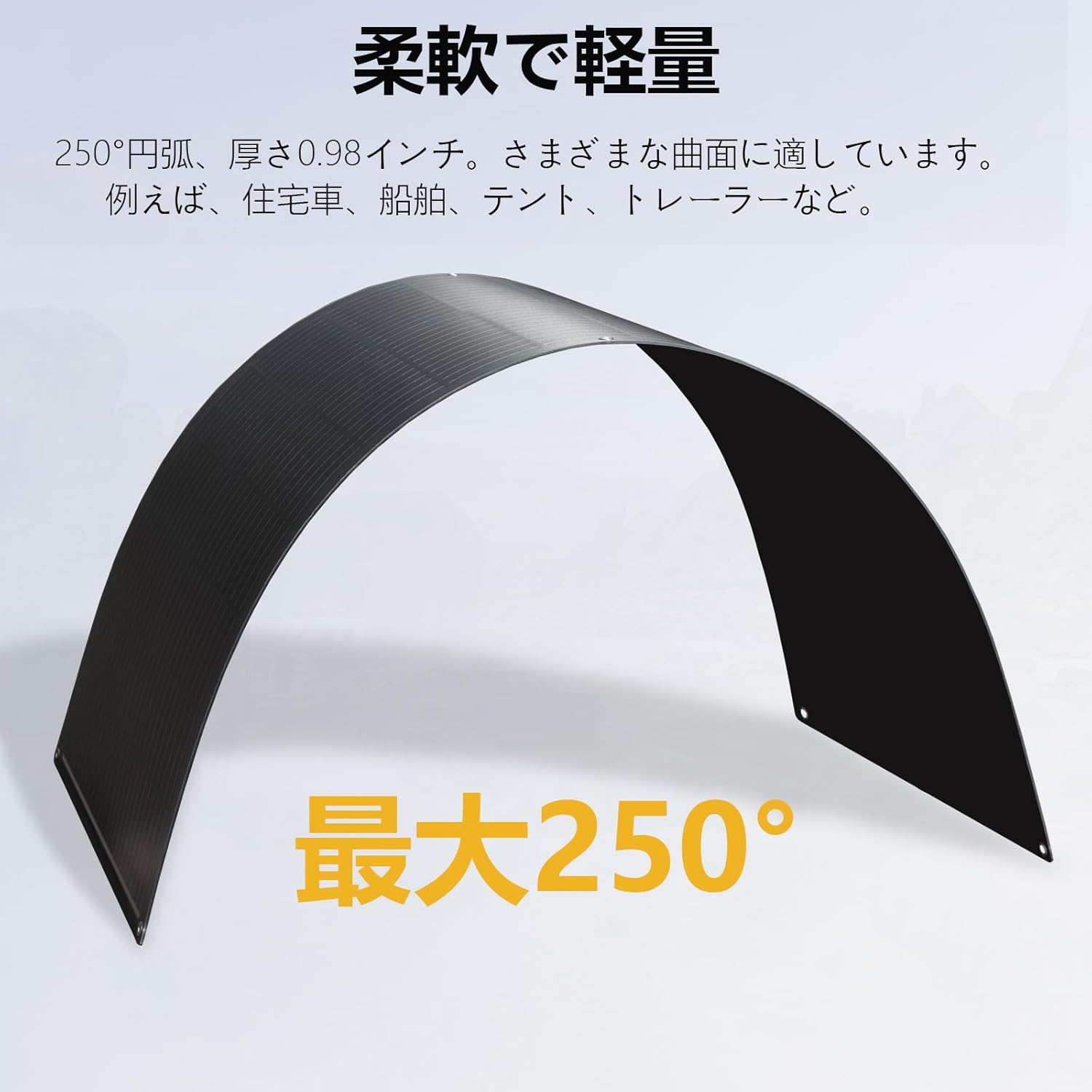 250°の曲げ対応で、車の屋根やボートの曲面など平面以外の場所にも柔軟に設置可能