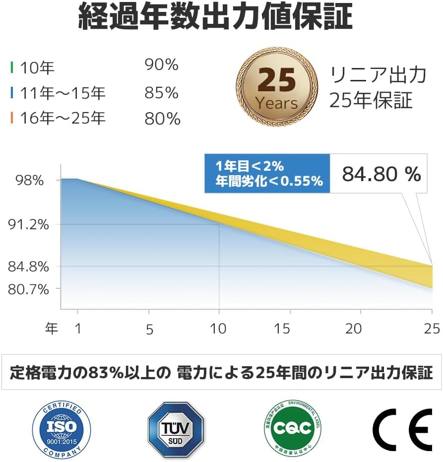 変換効率22%はデータベース平均18.5%を3.5ポイント上回る優秀な数値です。PERC先端セル技術を採用しており、同じ設置面積の従来型パネルと比較して約19%多くの太陽光エネルギーを電力に変換できます。