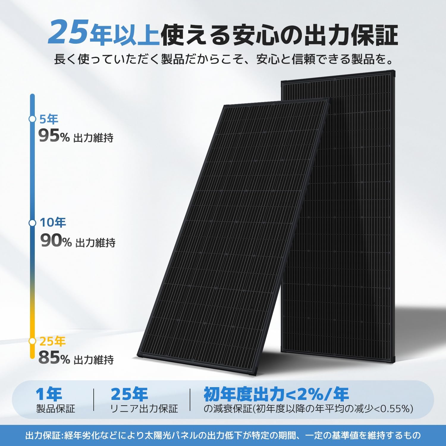 メーカー保証は1年間で、オンラインサポートが利用可能です。ソーラーパネルの一般的な期待寿命(20年以上)と比較すると保証期間は短めのため、長期運用を前提とする場合は購入前にYinleaderに延長保証の有無を直接ご確認ください。