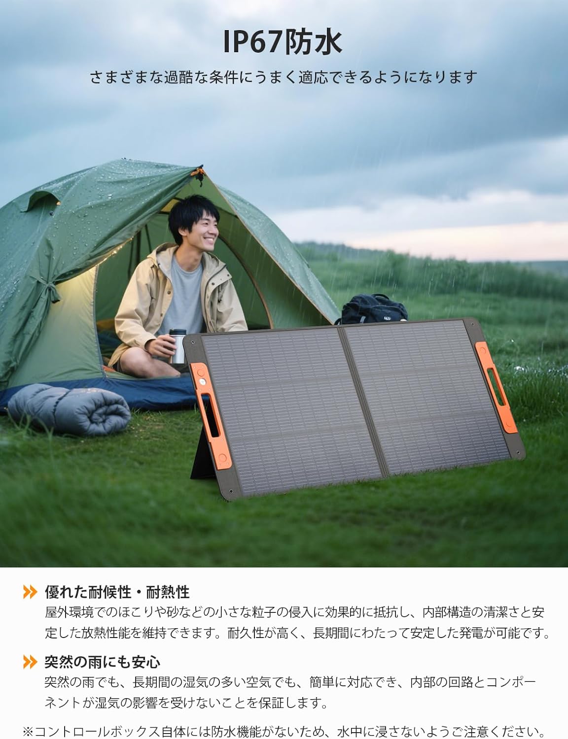 IP67防水等級を取得しており、粉塵の完全な遮断と一時的な水没(水深1mで30分間)にも耐える高い防水性能を持っています。雨天時の屋外使用も問題ありませんが、曇天や雨天時は発電量が大幅に低下する点はご留意ください。